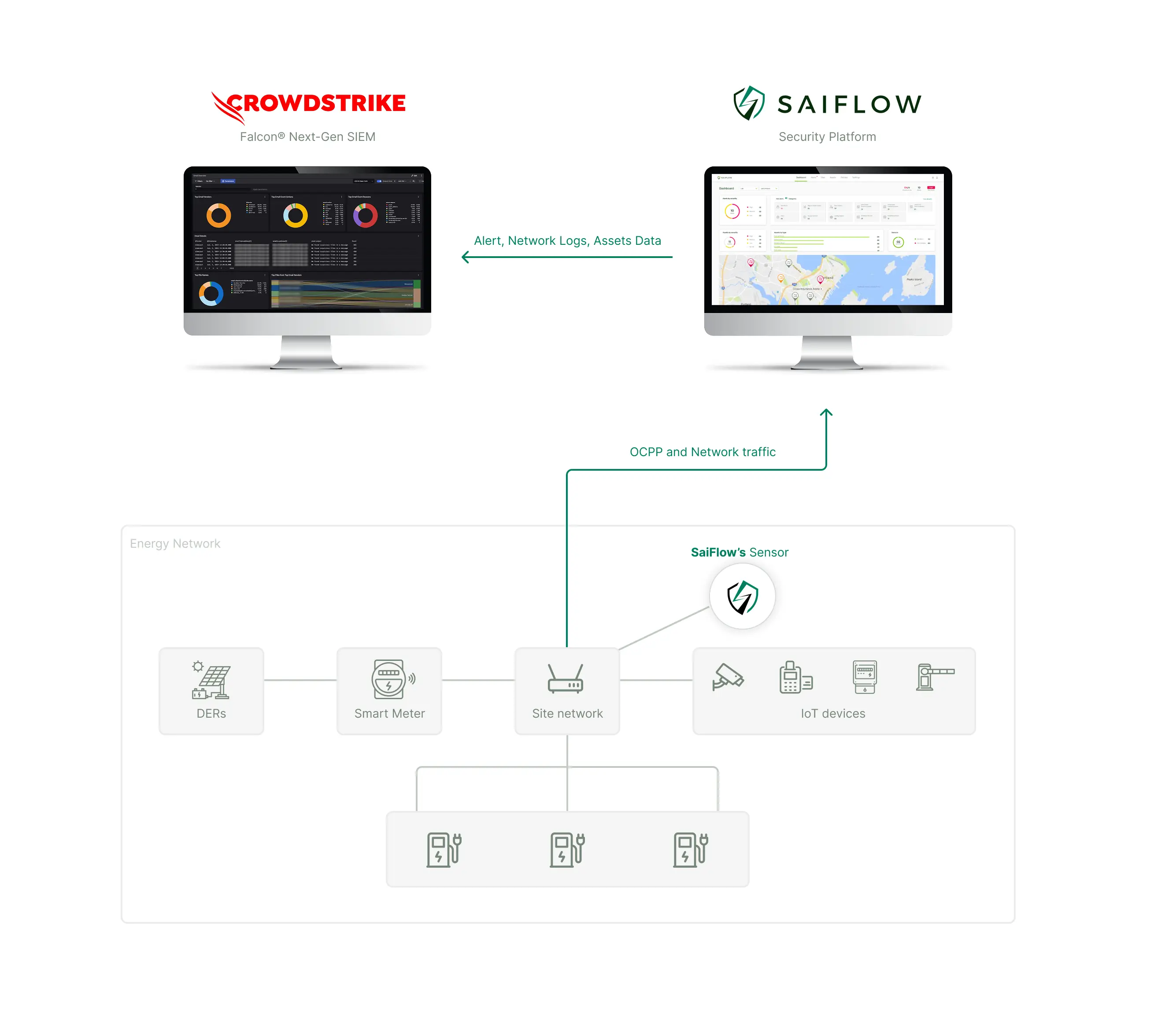 SaiFlow detects energy-layer anomalies and protocol abuse; CrowdStrike detects endpoint threats and lateral movement. SaiFlow alerts stream to Falcon Next-Gen SIEM for correlation with CrowdStrike telemetry, enabling cross-layer investigations.