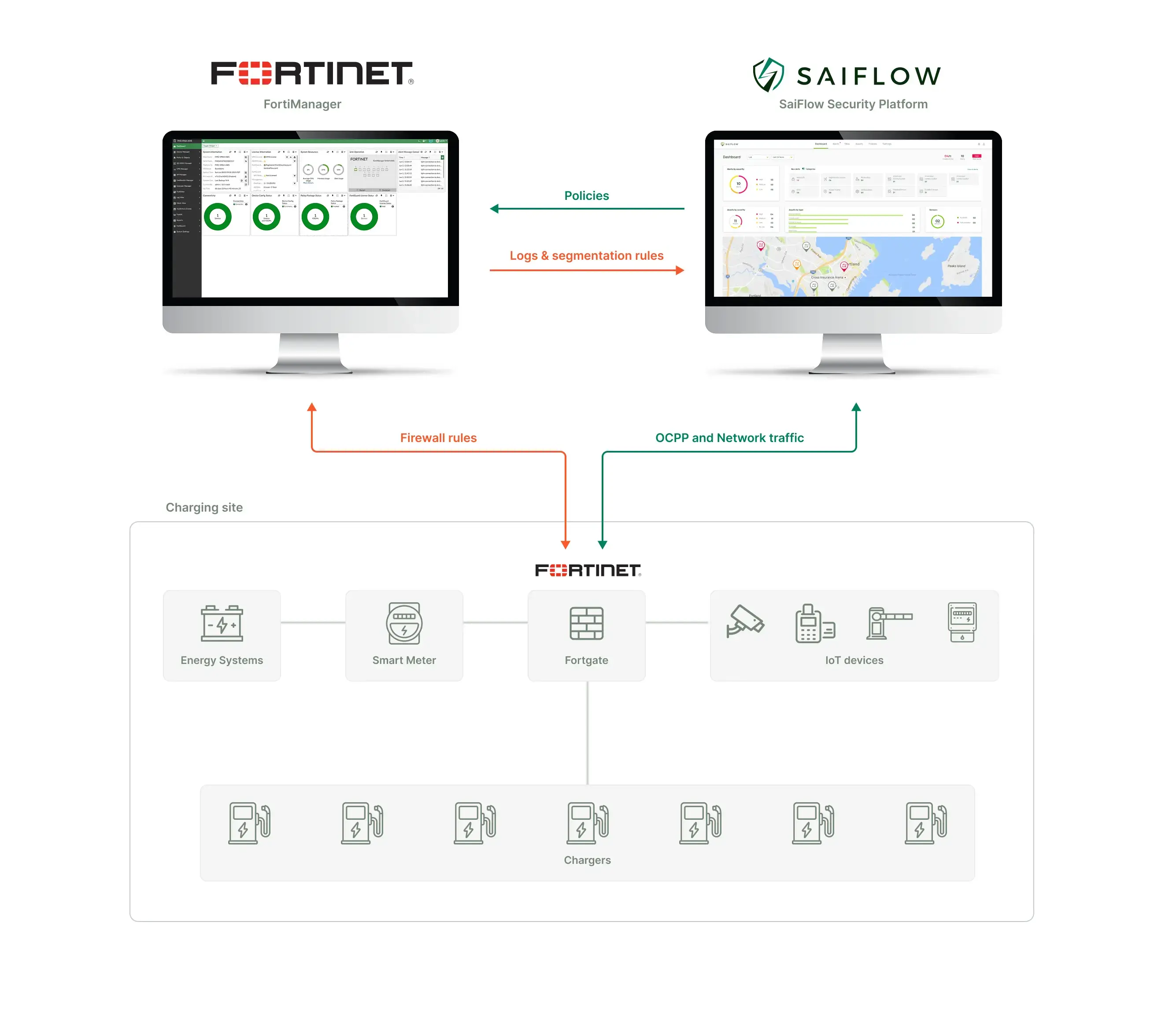 Our integrated solution pairs SaiFlow’s Energy Security Platform and OCPP Security Gateway with Fortinet’s FortiGate Next-Generation Firewalls, FortiAnalyzer, and FortiManager centralized policy management to offer: